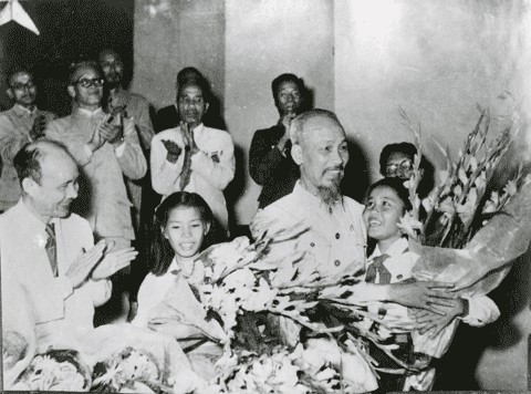 Chủ tịch Hồ Chí Minh tại Đại hội thành lập Mặt trận Tổ quốc Việt Nam, tổ chức tại Hà Nội, tháng 9-1955. Ảnh sưu tầm