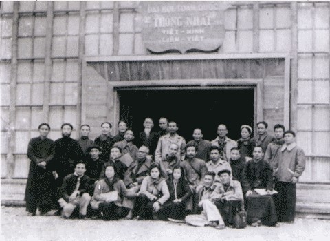 Chủ tịch Hồ Chí Minh cùng các đại biểu tham dự Đại hội Toàn quốc thống nhất Việt Minh Liên Việt, chụp ảnh lưu niệm ở Việt Bắc, tháng 3-1951. Ảnh sưu tầm