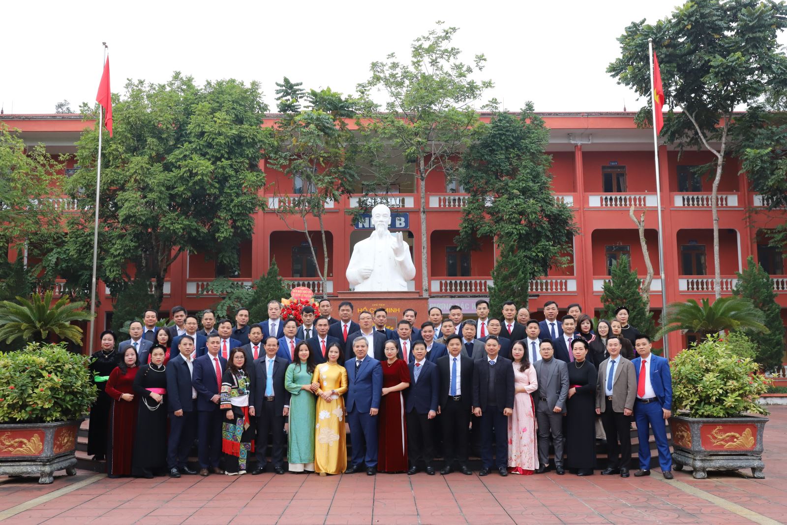 Tiến sỹ Vũ Văn Hậu, Phó Giám đốc Học viện Chính trị Khu vực I; ồng chí Nguyễn Văn Hiền, Phó Trưởng ban Tổ chức Tỉnh ủy và các học viên báo công trước Tượng đài Chủ tịch Hồ Chí Minh tại Trường Chính trị tỉnh (cơ sở 2)