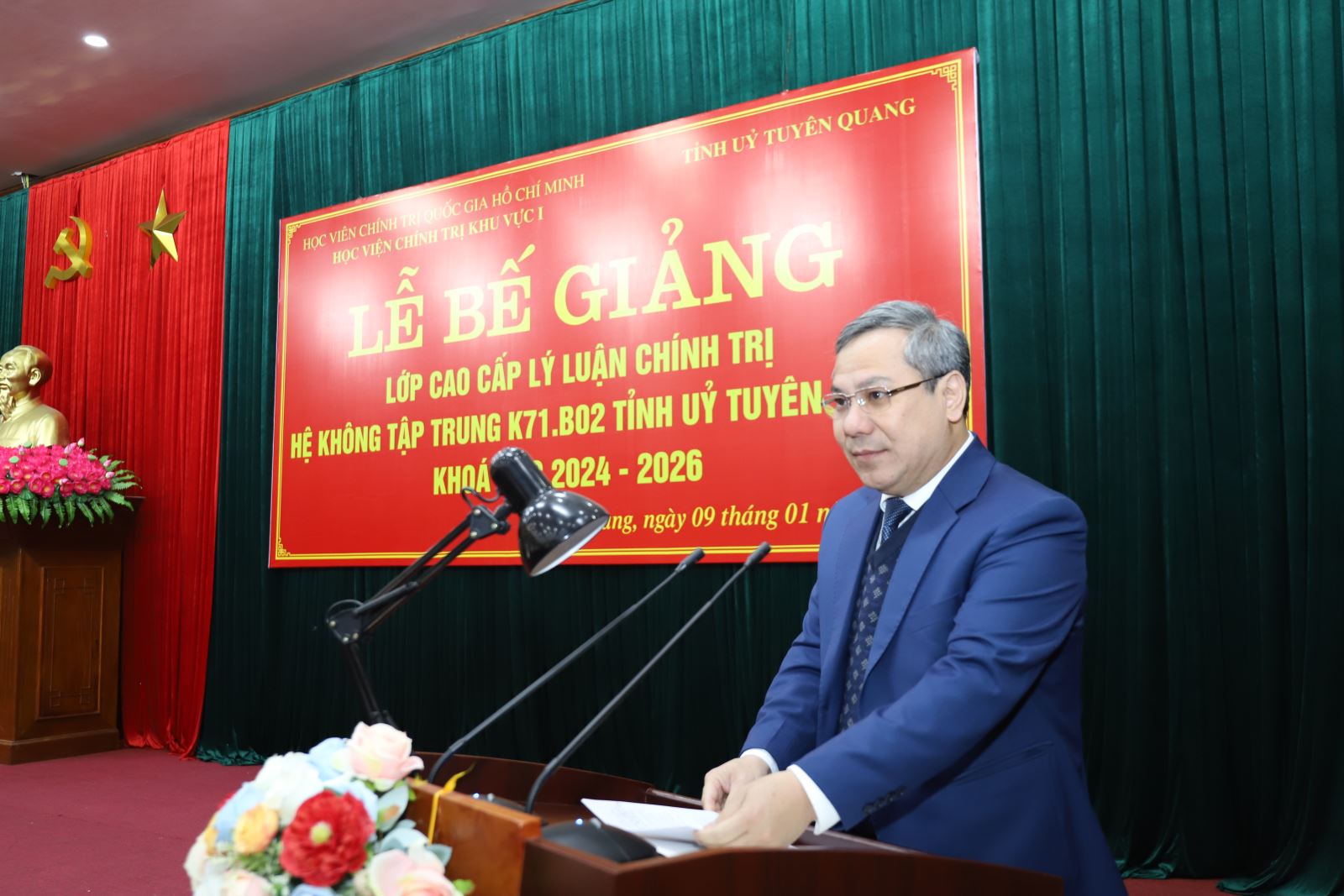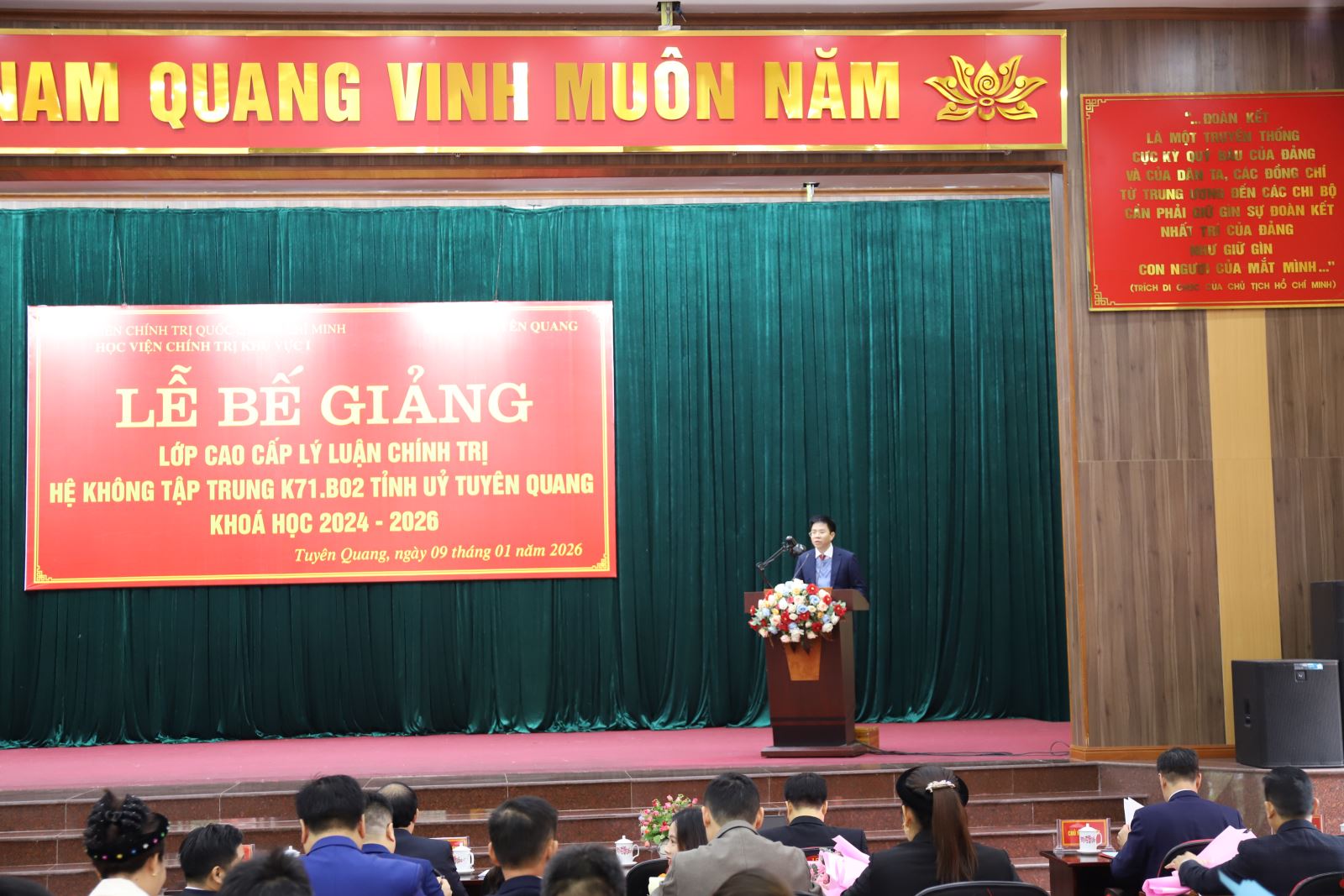 Sáng 09/01/2026, Học viện Chính trị khu vực I và tỉnh Tuyên Quang phối hợp tổ chức Lễ Bế giảng lớp Cao cấp lý luận chính trị hệ không tập trung K71.B02 Tỉnh ủy Tuyên Quang, khóa học 2024 - 2026 tại Trường Chính trị tỉnh Tuyên Quang (cơ sở 2).
